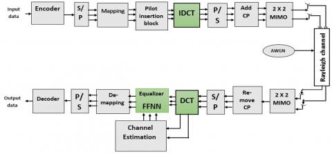 The using of DCT and FFNN will improve the performance of the overall system because, DCT is implemented using real arithmetic operations rather than complex operations, and also FFNNs will used to improve the performance of the system by providing better signal detection and interference cancellation. It can be used to detect and classify signals, reduce interference, and improve the accuracy of channel estimation. FFNN is designed to be fast and reduced the complexity of the system by reducing the number of parameters that need to be estimated. The FFNN that used is not a design Neural but rather its approximate neural so as to reflect the influence of the channel. The cost function of FFNN will be hard limiting activation function.