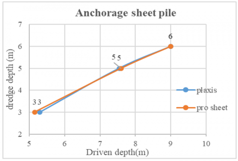 The investigation on sheet pile anchorage concentrated on horizontal displacements and driven depth. As demonstrated in Figures 51 and 52, a comparison analysis of the outcomes was conducted using ProSheet and the Plaxis program.