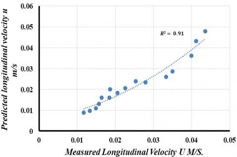 Comparisons of anticipated and measured velocities and turbulent kinetic energy are shown in Figures 6 for the upstream face of the bridge piers, respectively. With R2 (0.91) and R2 (0.97), respectively, the correlation coefficient for the k-epsilon turbulence model shows good agreement for longitudinal velocity (u) and (TKE).