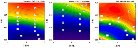 Figure 10 illustrates the contours of the Nu-ratio, f-ratio, and TEF. The Nu-ratio and TEF are shown at Re = 3000, while the f-ratio is displayed at Re = 16000. It is clear from the graphic that the f-ratio and Nu-ratio both rise in proportion to height. The results are consistent for both AFD-VD and AFD-VU. The TEF reaches its maximum value at B-R between 0.15 and 0.20, depending on the type of XVB.