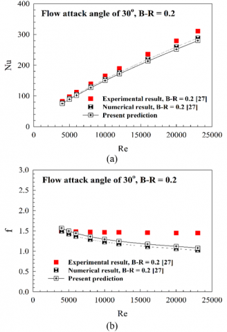 An essential step in numerical modeling analysis is the comparison of results with previously published research [27]. For this purpose, models with characteristics similar to the current study were selected to ensure relevance and accuracy. The comparison is illustrated in Figures 4(a-b), which present the Nusselt number and friction factor, respectively. The numerical results indicate that the trends of both the Nusselt number and the friction factor are consistent. In particular, as the Reynolds number rises, the friction factor tends to decrease and the Nusselt number tends to rise. All three components' values fall within a reasonable range of fluctuation.
