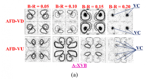 In order to analyze the thermo-hydraulic efficiency within the HX-SD with XVB installation, it is necessary to first understand the air-flow topology and thermal configuration occurring through the HX-SD. The working-fluid streamlines (air) in the CS plane of the HX-SD with XVB installation for types A, B, and C, respectively, at Reynolds number of 4000, for various B-R values and flow directions, are displayed in Figures 5(a)-(c). As seen in the figures, the installation of XVB in the HX-SD significantly affects the air flow. The XVB installation obstructs the flow, leading to a pressure drop. This pressure drop induces the formation of VTF as the air passes through the XVB. The VTF characteristics, when observed in the CS plane for all B-R values and flow directions, can be divided into four distinct regions due to the shape of the XVB. The flow structure exhibits symmetry both in the upper and lower sections, as well as in the left and right sides. The vortex core, denoted as VC, varies in number and position depending on the B-R value and air flow direction. The number of VCs can be observed to range from 4 to 8 axes. When examining the VTF in the lower half of the CS plane, at the centerline dividing the VTF, it is observed that different flow directions affect the vortex rotation (in the CS plane) in opposite directions. For example, at B-R=0.05 for XVB Type A, the AFD-VU flow direction results in a common-flow-up behavior (observed at the centerline of the lower pair of vortices), whereas the AFD-VD flow direction results in a common-flow-down behavior. These differences in flow characteristics affect the VTF strength, which is associated to the heat transfer behavior occurring in the HX-SD. In other words, when the fluid-flow behavior differs, the heat transfer characteristics also vary accordingly. The flow streamlines in the CS plane for all three XVB types are similar but not identical, due to the differences in the structure of each XVB type.