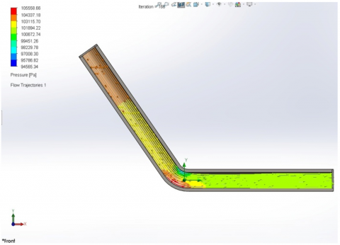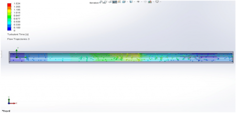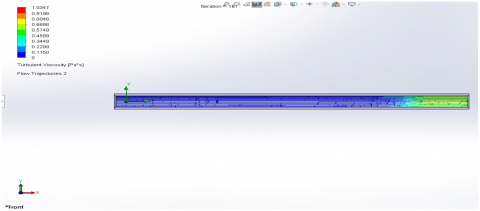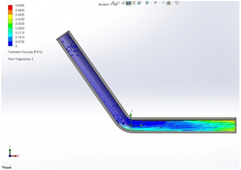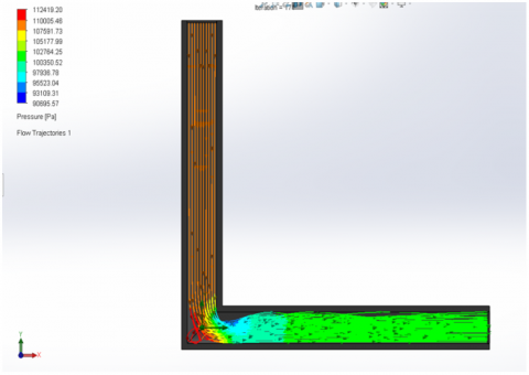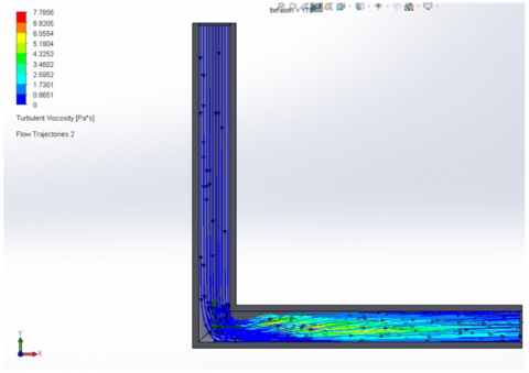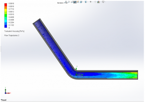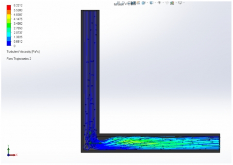 The ANSYS simulations demonstrate that turbulence is more pronounced in smaller-diameter pipes, especially in bends and junctions. Figure 10 highlights the presence of turbulent viscosity and flow trajectories, identifying recirculation zones where energy dissipation occurs.