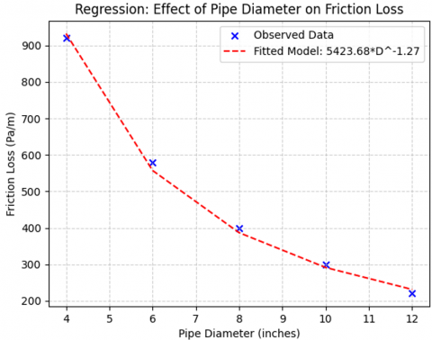 To model the effect of pipe diameter on friction loss, a power-law regression model was used: