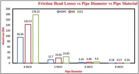 Figure 3. Plot of frictional head losses with respect to the pipe diameter and materials