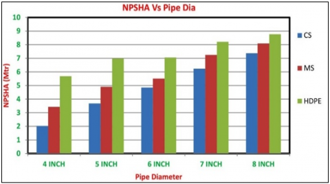 As a result of these reduced frictional losses, the NPSHA increases. The NPSHA is a measure of the available energy that prevents cavitation in the pump. By minimizing the energy lost to friction, more energy remains in the system to drive the suction process, thereby improving the NPSHA. Conversely, when smaller pipe diameters are used, fluid velocity increases, leading to higher frictional losses, which in turn decreases the NPSHA. This relationship between pipe diameter, fluid velocity, frictional losses, and NPSHA is clearly illustrated in Figure 3, which shows how increasing the pipe diameter enhances system efficiency by optimizing the energy distribution within the pumping system.