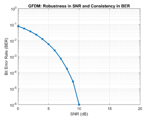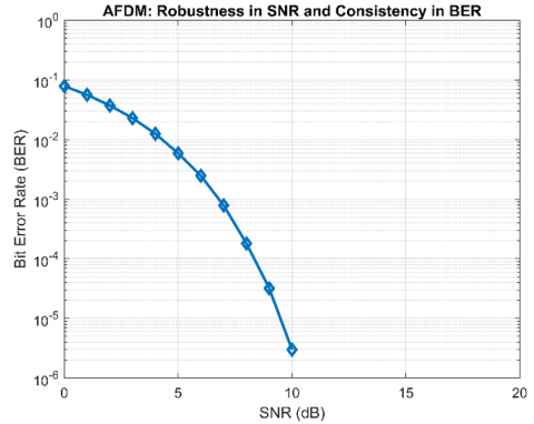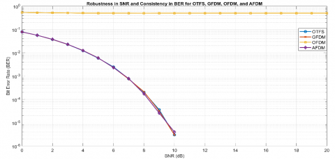 Figure 8. Robustness in SNR and consistency in BER for OTFS, GFDM, OFDM and AFDM