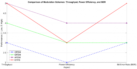 Table 2. Summary for throughput, power efficiency, and bit error rate for OFDM, GFDM, AFDM, and OTFS aspect