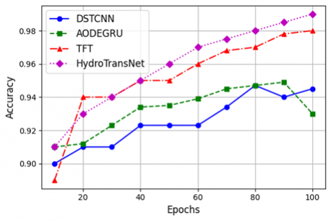 Figure 1 illustrates the accuracy of four models-DSTCNN, attention-based model known as the AODEGRU, temporal fusion transformer (TFT), and HydroTransNet-across multiple epochs. The accuracy of HydroTransNet is consistently increasing and reaches 99.1% by the 100th epoch which shows its strong learning ability and robustness among others. TFT also performs well with an accuracy rate of 98%, but it slightly falls behind HydroTransNet. AODEGRU has a good start with a peak performance of 94.9% but fluctuates around this value in later epochs which indicates that it may be sensitive to changes in data. DSTCNN improves steadily but plateaus at around 94.7%, suggesting that feature learning might have saturated.