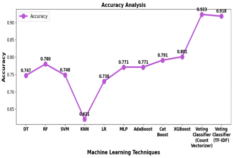 The F1-score values of 0.929 and 0.925, respectively for the Voting Classifier models which is Count Vectorizer and TF-IDF attained the higher F1-scores based on the demonstration of Figure 7. This suggests that as compared to individual models, classification performance is greatly enhanced by ensemble learning. While Logistic Regression (0.661) and KNN (0.648) had the lowest F1-scores among the separate classifiers, MLP (0.760), Random Forest (0.750), and Decision Tree (0.740) all did reasonably well. The effectiveness of boosting approaches was demonstrated by the superior performance of XGBoost (0.756) and AdaBoost (0.738) over some conventional classifiers.