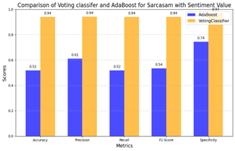 The comparison in Table 3 between AdaBoost and the Voting Classifier in sarcasm detection combined with sentiment analysis shows the superiority of the ensemble approach. The Voting Classifier achieved significant improvements in accuracy (0.941), precision (0.943), recall (0.941), and F1-score (0.941), highlighting the benefits of aggregating predictions from multiple models. In contrast to the Voting Classifier, AdaBoost showed lower accuracy and performance metrics, that indicates limitations in robustness through its focus on misclassified instances and its challenges with handling complex datasets like sarcasm detection.