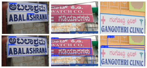 Figure 11 and Table 7 show the results of images of MSRA-TD500 dataset, first row contains results of without double edge component and second row shows results with double edge component (Double Yolo) model with 100 samples. It’s found that with degraded images resulted in more false negatives and f-score is much reduced in the absence of DE component.