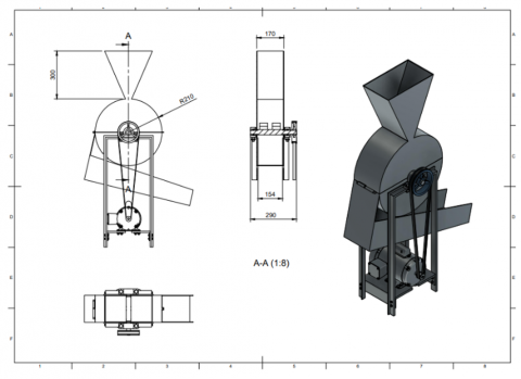 The orthographic projection and isometric view of the machine is displayed in Figure 1. Figure 2 presents the exploded view showing the different components of the machine, and pictorial view of the machine showing external parts and cracking hammer are shown in Figures 3 and 4, respectively.