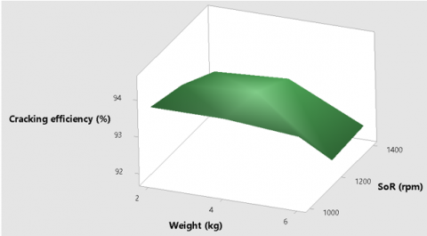 Cracking efficiency: According to Komolafe et al. [15], increased rotation speed is linked to increased machine efficiency. However, the high speed could cause more deformation on products to be cracked or dehulled. In this study, the efficiency of the machine is better at low speed of rotation (1000 rpm) while the weight of the palm nuts has no specific pattern of effects on the efficiency (Figure 14(e)). This was also noticed with the ANOVA analysis of the cracking efficiency considering the input parameters. For a cocoa depodding machine in the study of Iyanda et al. [24], an increase in speed resulted in decreased efficiency. Also, it was reported that an increase in the speed of a locust bean dehuller reduced the qualitative efficiency of the machine [21]. However, when depodding melon seeds, the efficiency increased with the speed of rotation of the machine [25] which negates the observed response in this present study.