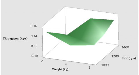 Cracking time: The palm nuts' cracking time and weight showed direct variation. The cracking time depends mainly on the weight of the palm nut processed per time. Though, the contribution of the speed of rotation is very small, its effect is considered significant in cracking a hard nut like palm nut. Increase in the speed of rotation reduces the cracking time. Hence, the relation between the speed of rotation and cracking time is inverse. This observation might be attributed to the increased speed of rotation of the shaft which has caused a higher number of impacts of the cracking hammers on the palm nuts. Figure 14(a) displays the surface plot of the cracking time with respect to the speed of rotation and weight.