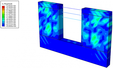 Figure 48. Stress distribution in the model and elements and the critical restraining element for explosion in the position of the upper layer