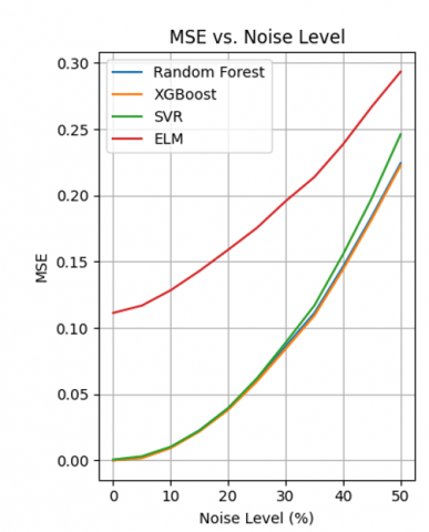The MSE, RMSE, MAE and R² curves in Figure 5 allow us to assess the robustness of four models (Random Forest, XGBoost, SVM, ELM) to different levels of Gaussian noise.