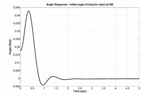 With the initial tilt angle of the robot being pi/180 rad, after 4 oscillations, the bicycle robot balance control system has brought the robot back to the equilibrium position (the robot's tilt angle is equal 0).