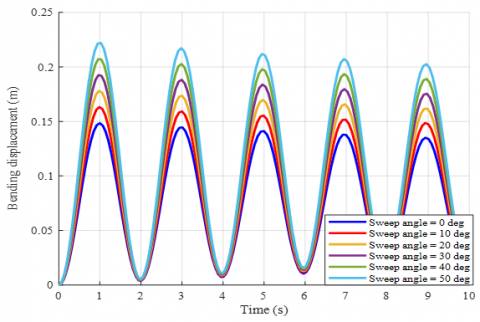 where, CMo, CMα, CMw, CMδ are the pitching moment coefficients, which depend on the same variable as the lift coefficients. The sweep angle (Λ) is the angle between the lateral axis of the wing and a line parallel to the leading-edge. For swept wing, the effective angle of attack (α) decreases by a factor of cos(Λ). This means that the aerodynamic forces driving both the bending and torsional modes are reduced in the coupled equations, this modifies the aerodynamic force terms as [16]: