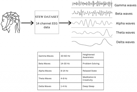 This study focuses on identifying user stress levels using the STEW dataset. The STEW dataset consists of 48 participants, where each participant took a SIMKAP test spanning 2.5 minutes each to induce stress. EEG signals were taken using the Emotiv EPOC device. The sampling frequency was 128 Hz. The dataset consists of 14 channels, each corresponding to AF3, F7, F3, FC5, T7, P7, O1, O2, P8, T8, FC6, F4, F8, and AF4, respectively. The STEW dataset consists of 2 sets of files, one before the candidates underwent the SIMKAP test indicated using subno_lo.txt file and the other after the candidates were subjected to the SIMKAP test indicated using subno_hi.txt file. (e.g., sub02_lo.txt for subject 2 at rest and sub22_hi.txt for subject 22 after the multitasking test). The rows represent the EEG signals and columns represent the 14 EEG channels. A ratings.txt file is provided that states each user’s respective stress levels on a scale of 0 to 9 before and after the conduct of the test [20].