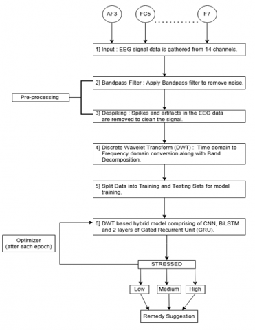 The research conducted by Gonzalez-Vazquez et al. [18] measured mental stress levels in participants using EEG signals and a video game. The game was about controlling a car to avoid obstacles and the difficulty level kept increasing as the game progressed. They collected data from 19 participants using an 8-channel device which was processed utilizing a Recurrent Neural Network with GRUs to categorize stress into four levels–Low (0), Moderate (1), Intermediate (2), High (3). They cleaned the EEG data using techniques like filtering, normalization, and data segmentation and then for training the Adam optimizer and a categorical cross-entropy loss function were employed, achieving up to 94% accuracy for individual participants.