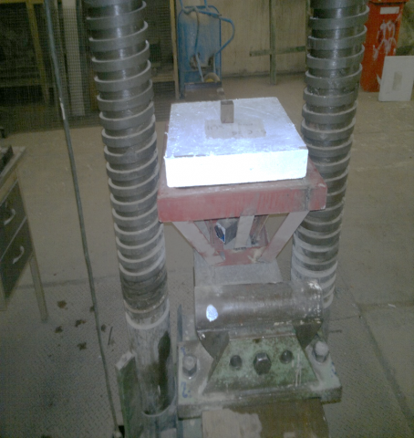 For the static loading specimens, we conducted testing by positioning the slab in rigid steel frame to be simply supported with a square shape of 420 mm clear dimension in each side. The static loads were applied from hydraulic universal testing machine, as shown in Figure 3. A steel column of 40 × 40 mm square section and 60 mm height was used to transfer the loads from machine into the slab. Loading was applied in a rate of 2 kN/min. continued up to failure. During the test stages, deflection was measured by using dial gauge of 0.01 mm divisions was located at the center of the bottom face of slab, as shown in Figure 4.