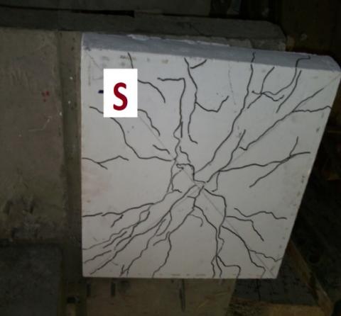 Regardless of the loading type, the zone at top face of the slab specimen that exposed to the applied load (steel ball or column) was penetrated and crater formed during cracks extending from the bottom face to reach the top face, as shown in Figure 10. Especially for the slabs (S1 and I1), the crater is not existing because they are cast with plain concrete, thus, they collapsed suddenly and spared into four sectors.