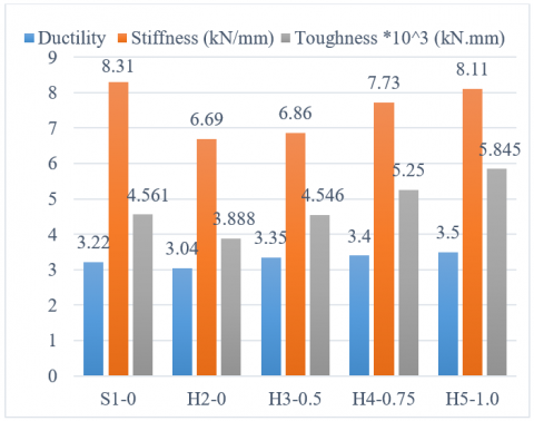 As it is clear in Figure 11, solid beams generally exhibit higher ductility than hollow beams due to their continuous mass, enabling greater plastic deformation and energy absorption before failure. For instance, the ductility of solid beam S1 was about 6% higher than that of hollow beam H21, aligning with findings by Abdullah et al. [29]. Adding steel fibers further enhanced ductility—by about 10, 12, and 15% for H31, H41, and H51, respectively—due to the fibers' tensile strength and crack-bridging ability, which improve deformation capacity and reduce brittleness in GPC.