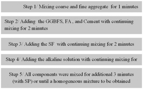 The mix proportions and preparation method for the geopolymer mortar were developed based on previous study [24]. At the initial stage of this research, several trial mixes were prepared and tested at 28 days of age. The results confirmed that the mix design shown in Table 3. provides suitable workability and strength for GPC. A constant alkaline activator-to-binder (AA/B) ratio of 0.4 was maintained, as this ratio has been shown to enhance both the microstructure and strength of the material. Additionally, a Na₂SiO₃ to NaOH ratio of 2.5 was adopted, in line with the study [24]. Various steel fiber volume fractions were used in the mixes of (0, 0.5, 0.75, 1) volume fraction percentages. The flow chart in Figure 3 explains the geopolymerization process.