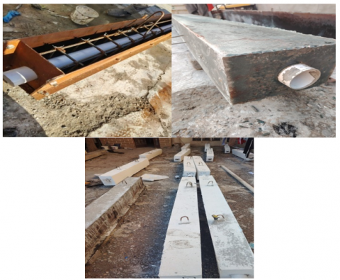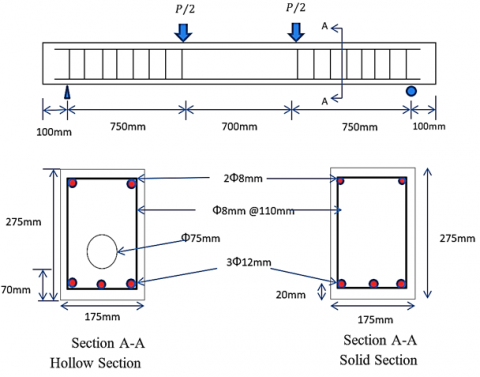 The beams were longitudinally reinforced with deformed steel bars of 12 mm and 8 mm diameters, while 8 mm deformed bars were used for the closed stirrups. To create hollow sections in the tension zone, 75 mm diameter plastic pipes were embedded. Being chemically inert, the plastic pipes do not interact with the reinforcement or geopolymer concrete constituents.