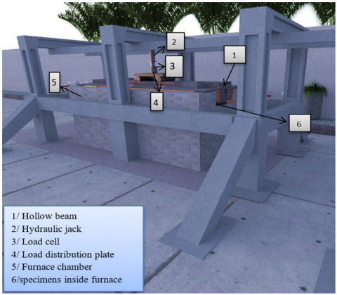 In this study, three sensor types were used: load cells, LVDTs, and type-K thermocouples. The thermocouples, connected to a digital recorder with ±1℃ accuracy, tracked temp inside and outside the beams, while LVDTs linked to a data logger measured deflections. Three thermocouples were also positioned along the furnace chamber to control the temp for the specimen (cubes, cylinders, prisms) inside the furnace and to record temp distribution for the furnace and along the beam's length. Each beam was subjected to a sustained service load equal to 50% of its max capacity. During fire subject at 250, 500, and 750℃, data on mid-span deflection and temp were collected until either failure occurred or the two-hour test duration ended, after which the burners were shut down. After completing the fire subject stage, the furnace was switched off and left to cool naturally for about two hours to avoid sudden thermal shock. Once the temp dropped to a safe level, the specimens were carefully removed and inspected. Each sample was then subjected to residual testing, which involved recording visible cracks, spalling, and surface discoloration, followed by measuring its mechanical performance (compressive, flexural, or tensile strength) to evaluate the remaining capacity after fire subject.