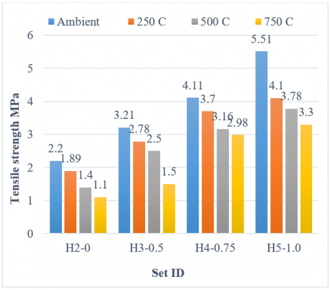 At 250℃, the tensile strength increased by 47%, 95%, and 117% for specimens H3 (0.5% SF), H4 (0.75% SF), and H5 (1.0% SF), respectively, compared to H2 (0% SF), following a trend similar to compressive strength. At 500℃, the residual tensile strengths were 1.4 MPa (H2), 2.5 MPa (H3), 3.16 MPa (H4), and 3.78 MPa (H5), reflecting increases of 79%, 125%, and 170% for fiber-reinforced mixes. This reduction in strength for H2 is attributed to partial decomposition and dehydration of calcium-aluminosilicate hydrate (C-A-S-H) due to limited water for chemical reactions. At 750℃, tensile strength continued to rise with increasing fiber amount: 1.1 MPa (H2), 1.5 MPa (H3), 2.98 MPa (H4), and 3.3 MPa (H5), marking gains of 36%, 170%, and 200% for H3, H4, and H5, respectively. The highest residual tensile strength (3.3 MPa) was achieved with 1.0% steel fiber, confirming the positive impact of fiber amount on thermal resistance. The tensile strength of GPC decreases with rising temp; however, adding steel fibers significantly improves its thermal resistance. At normal situations, strength increases with fiber amount, from 2.2 MPa (0% SF) to 5.51 MPa (1.0% SF). As the temp rises to 250, 500, and 750℃, all mixes show reduced strength, but fiber-reinforced specimens retain higher magnitudes. At 750℃, the 1.0% SF mix still achieves 3.3 MPa, compared to 1.1 MPa for the control. Overall, steel fibers enhance the residual tensile strength of GPC under high temps.