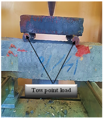 The modulus of rupture (fᵣ) of the GPC prismatic specimens was determined under normal situations and following subject to various fire intensities using a two-point load, in accordance with the reference [27], as illustrated in Figure 9. Prismatic specimens measuring 10 × 10 × 50 cm were tested at 28 days of age. For each GPC mix, the reported strength represents the mean magnitude obtained from three specimens. Residual modulus of rupture tests was performed on prisms subjected to fire temps of 250, 500, and 750℃. In total, 48 prisms were tested, with the mean strength of three specimens reported for each mix. Figure 9 illustrates the impact of high temps on the flexural strength (modulus of rupture) of GPC specimens. An apparent decline in strength is observed as the temp increases across all steel fiber amount levels. For example, the modulus of rupture for the control specimen (H2-0%SF) decreases by 14% at 250℃ compared to normal situations.