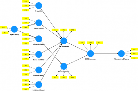The structural model consists of eleven latent constructs. Six exogenous constructs AI Capability (X1), System Usability (X2), Information Quality (X3), Service Availability (X4), Privacy & Security (X5), and Institutional Support (X6) serve as primary predictors that influence two mediators: User Satisfaction (M1) and Service Experience (M2). These mediating variables affect Customer Relationship Management (CRM) Enhancement (Y1), which ultimately leads to Administrative Efficiency (Y2) as the final dependent outcome. A critical moderator, Digital Literacy (Z1), is introduced to examine how individual digital competencies influence the relationships between input variables (X) and satisfaction (M1). The model captures both functional system attributes and user-centered experiences, enabling a nuanced understanding of AI integration beyond technical performance. By placing CRM at the strategic center of the framework, the model shifts the focus from transactional interactions to long-term relationship value. This structure aligns with the goal of promoting sustainable service innovation in higher education by bridging digital transformation with human-centric outcomes.