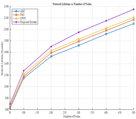 Figure 3 shows network lifetime across varying node densities (50–500 nodes). The ANCA-FCM-DQL approach extends lifetime by up to 35%, due to balanced energy distribution achieved through adaptive nest-based placement and energy-aware clustering. Unlike PSO, GWO, and ABC, which cause energy holes around the sink, ANCA dynamically adjusts node engagement to avoid early node death.