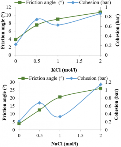 Figure 12. The effect of KCl and NaCl salts on friction angle and cohesion