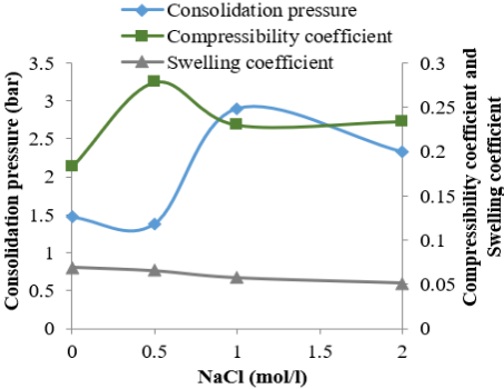 On the other hand, an increase in the compressibility coefficient (Cc) was noticed by 8.3% and 28.6% for 2 M concentration of KCl and NaCl respectively. According to the obtained values of swelling coefficient and compressibility coefficient, the soil was altered from a swelling soil category to a low swelling soil category, after the addition of the highest concentration of salts. And it was changed from a moderately compressible soil to a quite highly compressible (after addition of 2 M of NaCl).