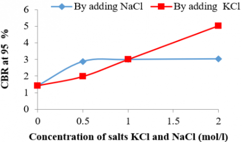 Remarkably, the maximum CBR value was reached by adding the highest concentration 2 M of KCl which leads to an increase of 252%. In contrast, the CBR values under NaCl values under NaCl effects reached a plateau at around 0.75M concentration, and stayed constant up to 2 M. The induced increase is of 113%.