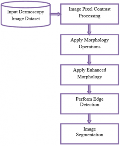 The outcomes of segmentation have a profound impact on all the subsequent steps of image analysis, including object representation and description, feature measurement, and even higher-level tasks like object classification and scene interpretation, making it a crucial component of automatic image analysis [26]. The process essentially entails dividing a digital image into various zones that correspond to specific surfaces, objects, or intrinsic object features. It entails classifying each pixel, then finding clusters of pixels that have certain visual traits or areas that are similar to one another. Each of these areas may, ideally, represent an object or pattern in the image. This research proposes a Multi-Level Image Quality Enhancement Model using Enhanced Morphology Model with Edge-Based Segmentation (MLIQE-EMM-ES) for accurate detection of melanoma in dermoscopy images.