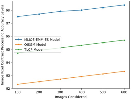 Accuracy for the QISGM model begins at 92.3% with 100 images and rises to 93.3% with 600 images. Its performance is still significantly lower than MLIQE-EMM-ES, suggesting less effective contrast processing, particularly in low-contrast circumstances, although it does exhibit a similar rising trend. Based on 100 images, the TLCP model achieves 94.7% accuracy, which improves to 95.7% after 600 images, although it is still behind MLIQE-EMM-ES. While TLCP's collaborative categorization methodology is useful, it falls short of the proposed strategy when it comes to contrast enhancement quality.