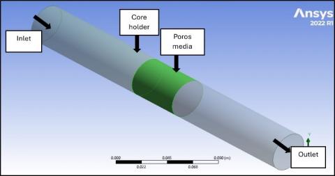 To simulate the plug holder, the researchers employed a three-dimensional numerical simulation with a horizontal metal pipe of 20 cm in length and 3.81 cm in diameter. As shown in Figure 1, this pipe contained a porous media replicating the rocks in an oil well, with dimensions of 5 cm in length and 3.81 cm in diameter. The study concentrated on examining the flow of crude oil through the porous media.