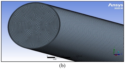 The rock carrier and porous medium were divided into hexagonal cells of a certain size, which are more accurate for studying fluid flow inside cylindrical shapes, as shown in Figure 2(a). A finer mesh design is needed to improve performance, especially in regions with large fluctuations in flow. Although finer meshes require more processing power and time, A mesh independence study was essential and was carried out by performing multiple simulations using varying mesh resolutions, starting with a coarse mesh and progressively refining it until further refinement had no significant impact on the simulation results [17]. Through this process, the optimal global mesh size was identified, resulting in a maximum cell dimension of approximately 180 μm within the core region of the model. To accurately capture the steep gradient variations typically present near the wall caused by the no-slip boundary condition inflation layers were incorporated adjacent to the wall, as illustrated in Figure 2(b). This leads to a more accurate prediction of the flow in this region [18]. Five inflation layers were created, covering about 20% of the model radius.