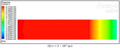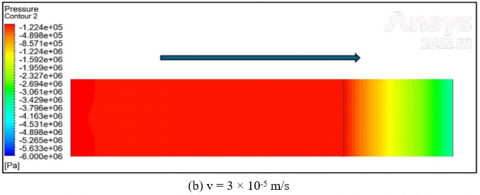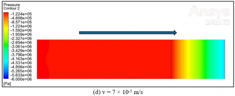 Figure 4 presents the pressure contour distributions inside the porous medium at a constant temperature of 40°C for four different crude oil inlet velocities (1 × 10⁻⁵, 3 × 10⁻⁵, 5 × 10⁻⁵, and 7 × 10⁻⁵ m/s). The pressure ranges from approximately 9.76 × 10⁵ Pa near the outlet (blue zones) to 6.83 × 10⁶ Pa near the inlet (red zones). The color gradient clearly reflects the pressure drop occurring due to flow resistance across the homogeneous porous structure. As velocity increases, the pressure gradient becomes steeper, indicating more rapid saturation of the porous medium.