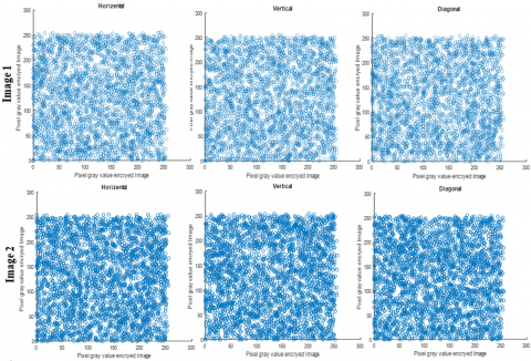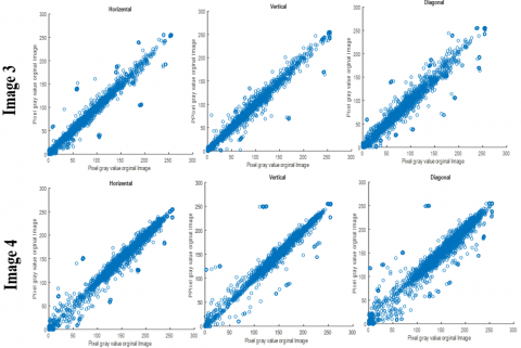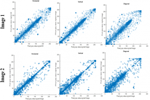 Therefore, successful encryption leads to lower C.C. values, and are calculated using Eq. (3) by $\rho_{x y}$. Figure 9 shows the (C.C) of the source picture for the Horizontal Correlations (H.C), Vertical Correlations (V.C), and Diagonal Correlations (D.C) and Figure 10 explains the (C.C) of the encrypted picture. In Table 1, the (C.C) of the proposed approach is presented in five pictures.
