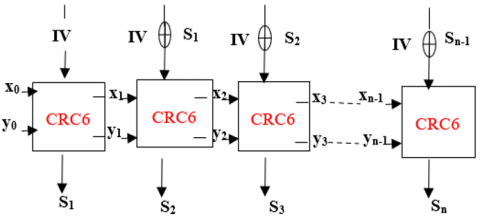 According to the Algorithm 5, this system produces long random that are 128 bits. The first RC6 input is ($x_0$), the second RC6 input is ($y_0$), and $m_i$ is the intermediate, as shown in Figure 6. Then, $S_i$ is the CRC6 output.