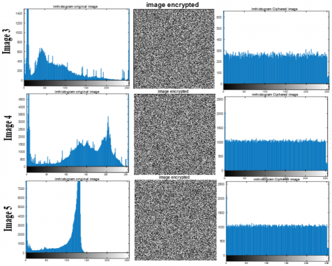 Figure 8. The suggested decryption and encryption mechanism for medical pictures: Medical picture histogram, Picture encrypted, Encrypted picture histogram