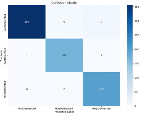 MobileNet demonstrated superior performance than VGG16 according to all measurement criteria where it achieved a total accuracy score of 96.50% as shown in Table 3. The MildDemented category achieved an F1-score of 0.97 together with a precision level of 0.99 and recall measurement of 0.95. The detection metrics for NonDemented equaled 0.93, 0.99, and 0.96 and VeryDemented metrics showed 0.95, 0.96, and 0.95. The confusion matrix in Table 4 demonstrates the model's excellent reliability by properly identifying 355 cases of MildDemented along with 176 instances of NonDemented and 186 VeryDemented cases among the total 743 instances. MobileNet achieved superior class distribution together with enhanced generalization capabilities by reducing the number of wrong negative outcomes and incorrect positive predictions. The model achieves good performance due to its lightweight structure and efficient depthwise separable convolutions that eliminate parameter redundancies and enhance prediction generalization capabilities.