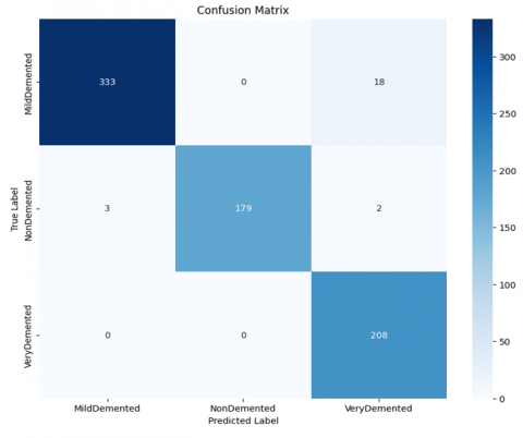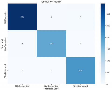 The evaluation of the proposed models was conducted through the analysis of confusion matrices, which provide a comprehensive overview of classification performance across different AD stages. Figure 3 presents the confusion matrix for the VGG16 model, where a moderate number of misclassifications is observed, particularly between MildDemented and VeryDemented categories. Figure 4 shows the confusion matrix for the MobileNet model, which demonstrates improved classification performance compared to VGG16, with fewer misclassified instances and a clearer distinction between classes. Finally, Figure 5 illustrates the confusion matrix for the hybrid model combining MobileNet with Snake algorithms. This hybrid model exhibits the most balanced and accurate classification performance, with near-perfect separation between the MildDemented, NonDemented, and VeryDemented classes. The significant reduction in misclassifications highlights the effectiveness of the proposed hybrid optimization approach in enhancing AD stage prediction accuracy.
