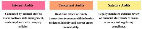There are various types of audits in auditing that have been carried out to maintain financial integrity and comply with regulations [6]. Audits can be mainly categorized into three types, which include internal audits, concurrent audits, and statutory audits as indicated in Figure 3. Internal audits involve a company's own staff or an independent internal team evaluating internal controls, risk management, and governance processes. Concurrent audits are live examinations of bank or financial house financial transactions to detect and correct faults in time. Statutory audits are legal compulsions of having an external auditor examine a company's financial statements to ensure their accuracy and compliance with the legal and regulatory standards [7].