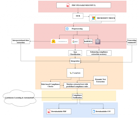 Langchain acts as the mother model layer for our system, performing several key functions like orchestration of various functions and procedures in a orderly fashion. Langchain is responsible for chunking documents by splitting big documents into semantically relevant pieces of 500-1000 tokens, supporting the processing of long financial documents in an efficient manner. Retrieval Augmented Generation (RAG) is also a possible approach denoted by the framework in the form of having a embedded-vector database containing the set of compliance rules and regulations provided by the authorities, which then goes through a systematic flow of rule matching against document text. Langchain is also responsible for handling prompt engineering and model chaining, with OCR model outputs being systematically input to NLP models using carefully designed prompts that incorporate compliance context and discrete regulatory requirements.